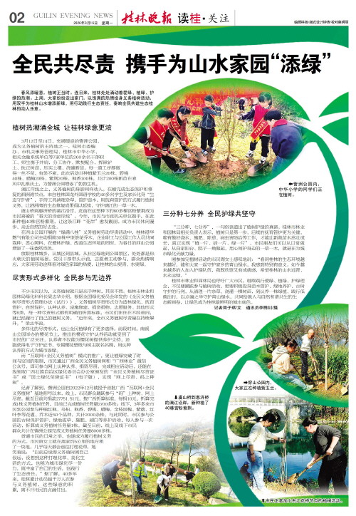 春风添暖意,植树正当时。连日来,桂林处处涌动着爱绿、植绿、护绿的热潮。上周,大家纷纷走出家门,以饱满的热情投身义务植树活动,用双手为桂林山水增添新绿,用行动践行生态责任,奏响全民共建生态桂林的动人乐章。