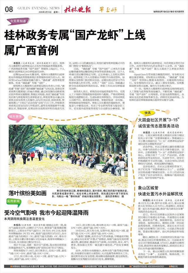 下一步,桂林市大数据和行政审批局将持续深化人工智能与政务服务深度融合,不断拓展“漓政通”专属“国产龙虾”应用场景,打造全流程智能化、全域安全化的政务服务新生态,持续优化营商环境,为桂林打造世界级旅游城市提供坚实数字支撑。