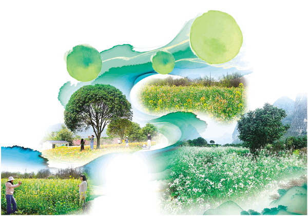 本地摄影爱好者李先生接受采访时说:“这里的游玩体验很棒,可以在漓江边喝茶休息,也可以在树林里感受大自然的绿意盎然,体验林间荡秋千的惬意,还可以徜徉在花海间赏景拍照。”