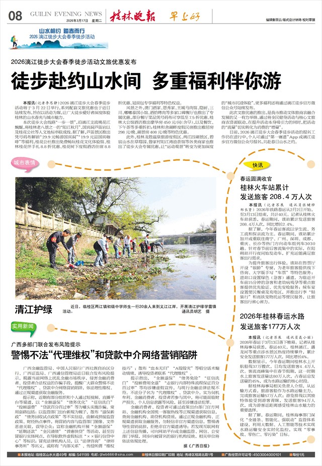 发送旅客177万人次   本报讯(记者苏展 通讯员聂小丽)2026年春运于3月13日落下帷幕。记者从桂林海事局获悉,春运40天,桂林漓江、遇龙河等重点涉水景区热度持续攀升,累计安全发送旅客177万人次,同比增长4%。
