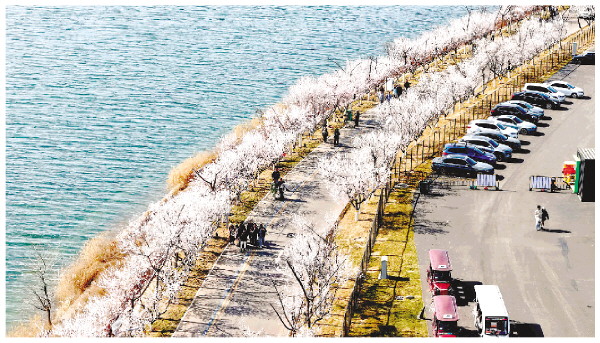 3月16日,游客在河北省石家庄市滹沱河畔赏花游玩(无人机照片)。
