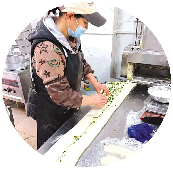 老板娘在制作葱花卷。