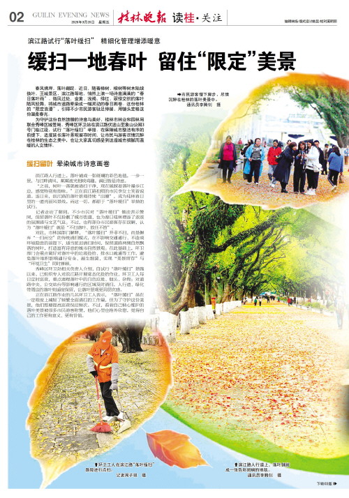 “之前,树叶一落就被清扫干净,现在能踩着落叶漫步江边,感觉特别有韵味。”正在滨江路拍照的市民李女士笑着说道。连日来,滨江路的落叶景观持续“出圈”,成为桂林春日里的一道亮丽风景线,而这一切,都源于“落叶缓扫”举措的试行。