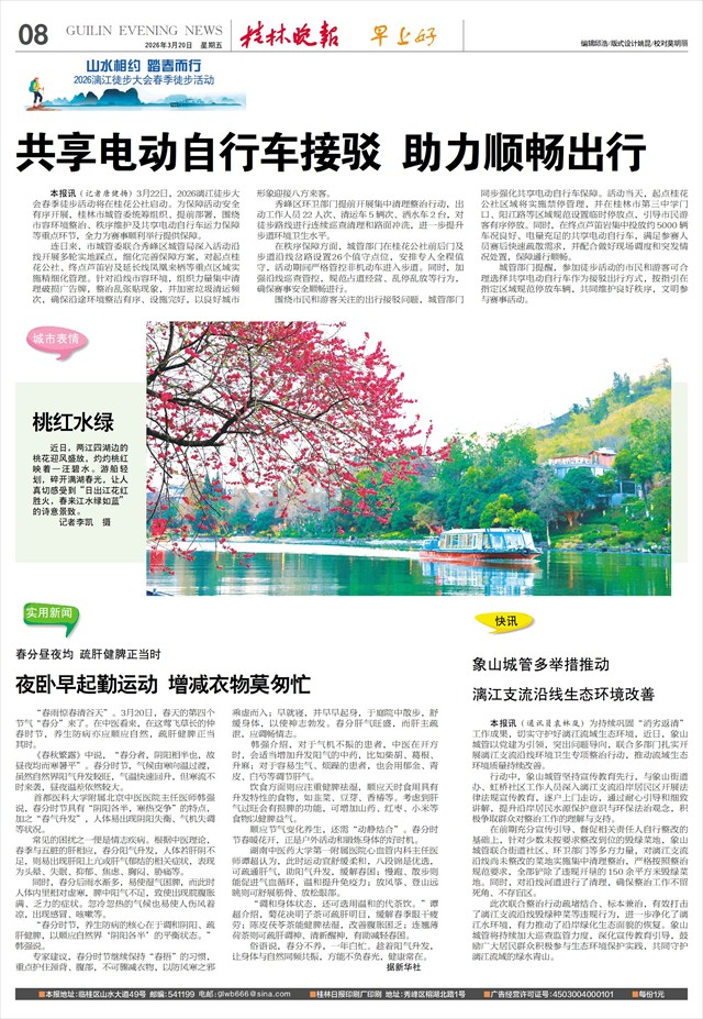共享电动自行车接驳 助力顺畅出行   本报讯(记者唐健扬)3月22日,2026漓江徒步大会春季徒步活动将在桂花公社启动。为保障活动安全有序开展,桂林市城管委统筹组织、提前部署,围绕市容环境整治、秩序维护及共享电动自行车运力保障等重点环节,全力为赛事顺利举行提供保障。