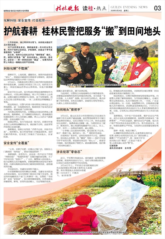 化解纠纷 安全宣传 打击犯罪…… 护航春耕 桂林民警把服务“搬”到田间地头   三月的桂林,漓江两岸草长莺飞,田间地头随处可见忙碌的身影。