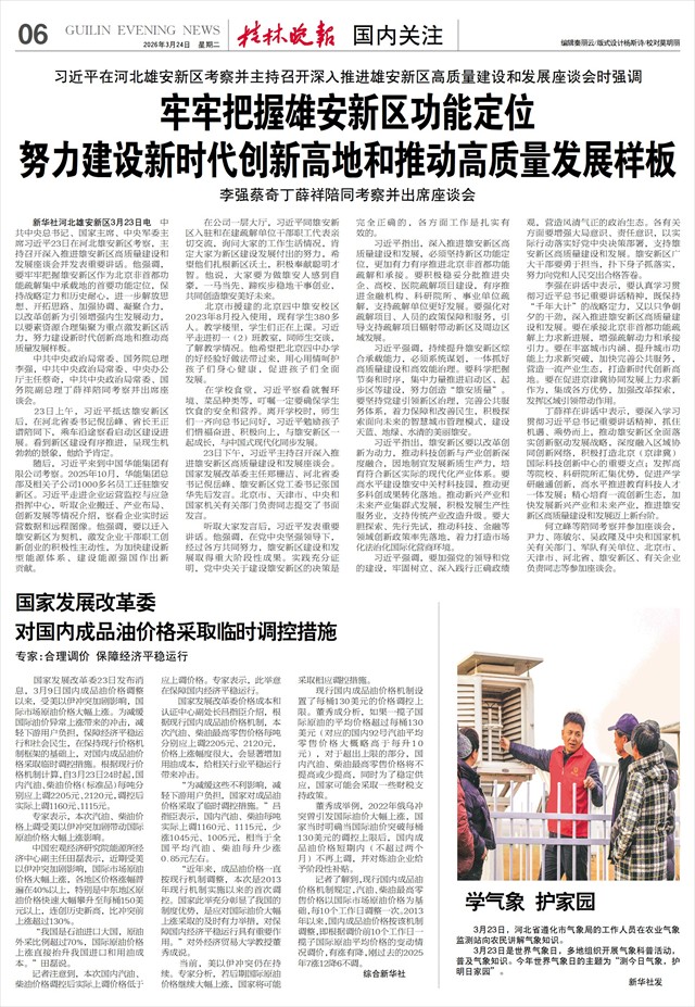 努力建设新时代创新高地和推动高质量发展样板 李强蔡奇丁薛祥陪同考察并出席座谈会   新华社河北雄安新区3月23日电 中共中央总书记、国家主席、中央军委主席习近平23日在河北雄安新区考察,主持召开深入推进雄安新区高质量建设和发展座谈会并发表重要讲话。他强调,要牢牢把握雄安新区作为北京非首都功能疏解集中承载地的首要功能定位,保持战略定力和历史耐心,进一步解放思想、开拓思路、加强协调、凝聚合力,以改革创新为引领增强内生发展动力,以要素资源合理集聚为重点激发新区活力,努力建设新时代创新高地和推动高质量发展样板。