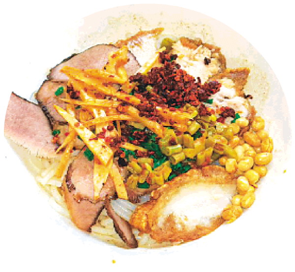 记者看到,操作台上的锅烧、牛肉、叉烧、猪耳朵、牛肚等多种卤菜码得整整齐齐,卤香混着米粉的米香,勾得人食欲大开。“我们家米粉五元二两,卤菜品种丰富。”潘小云一边给客人配菜,一边笑着向记者介绍。店里不用常见的不锈钢碗,清一色都是厚实的大瓷碗。“瓷碗能装更多,拌粉的时候也更顺手,味道能裹得更匀。而且自己清洗和消毒,客人吃着放心,我也安心。”