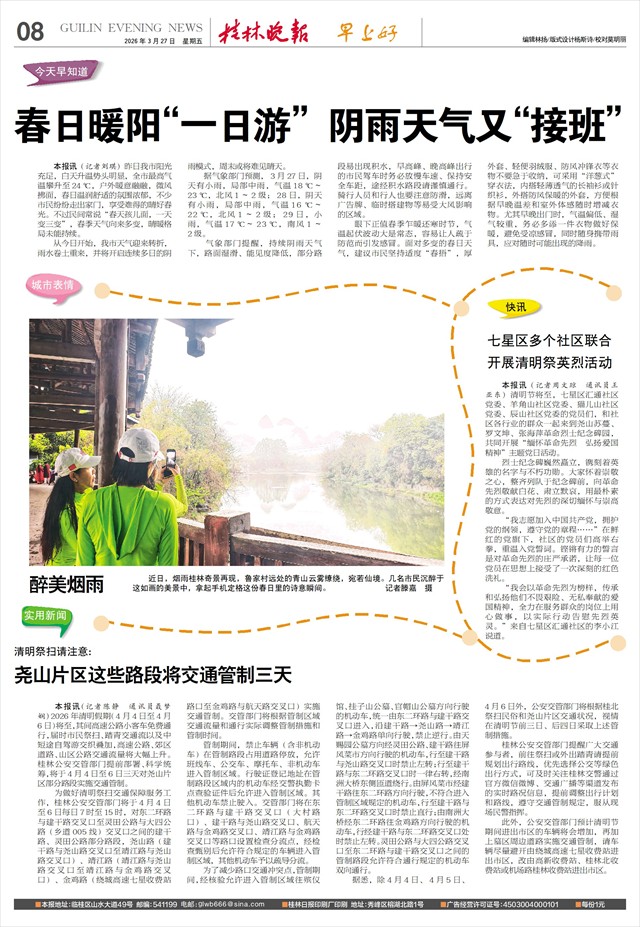 清明祭扫请注意: 尧山片区这些路段将交通管制三天   本报讯(记者陈静 通讯员聂梦娴)2026年清明假期(4月4日至4月6日)将至,其间高速公路小客车免费通行,届时市民祭扫、踏青交通流以及中短途自驾游交织叠加,高速公路、郊区道路、山区公路交通流量将大幅上升。桂林公安交管部门提前部署、科学统筹,将于4月4日至6日三天对尧山片区部分路段实施交通管制。