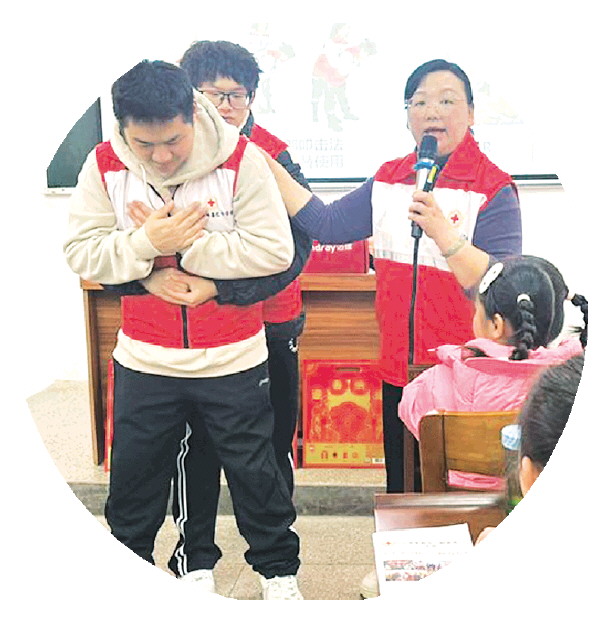 ←张玲在红十字应急救护培训基地开展“大手牵小手 救在身边”应急救护公益培训亲子活动。