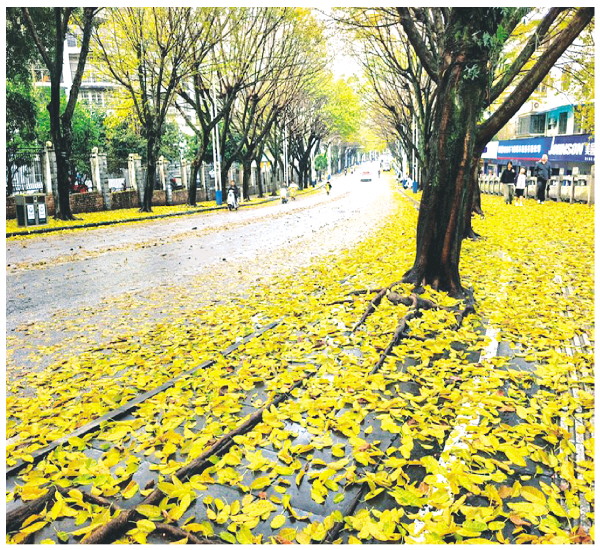 3月29日下午,一场大暴雨过后,七星区毅峰路迎来了独有的春日浪漫。道路两旁的黄葛榕在雨水冲刷下,金黄的叶片纷纷飘落,铺满了整条街道,宛如一条“黄金大道”,尽显诗情画意。