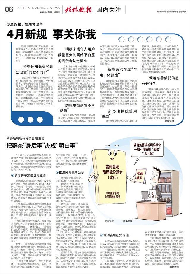 殡葬领域明码标价新规出台 把群众“身后事”办成“明白事”   3月31日,市场监管总局会同民政部对外发布《殡葬领域明码标价规定(试行)》,为各类经营者明码标价提供分类指引。殡葬是关系千家万户的民生问题,新规提出哪些具体要求?如何防范“天价”收费?
