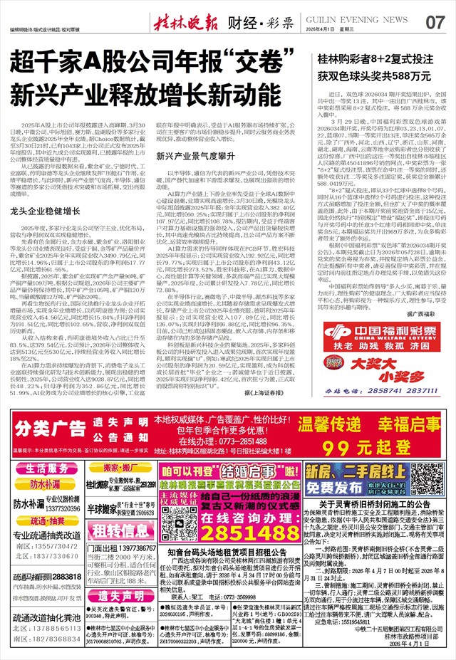 新兴产业释放增长新动能   2025年A股上市公司年报披露进入高峰期。3月30日晚,中微公司、中际旭创、赛力斯、盐湖股份等多家行业龙头企业披露2025年全年业绩。据Choice数据统计,截至3月30日21时,已有1043家上市公司正式发布2025年年度报告,其中近九成公司实现盈利,已披露年报的上市公司整体经营质量稳中有进。