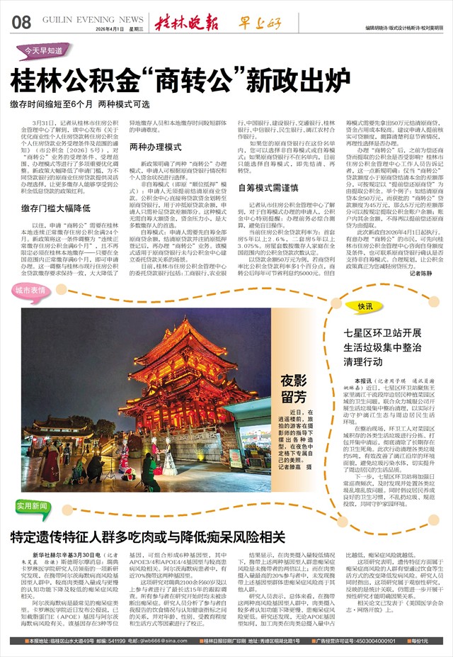 桂林公积金“商转公”新政出炉 缴存时间缩短至6个月 两种模式可选   3月31日,记者从桂林市住房公积金管理中心了解到,该中心发布《关于优化商业性个人住房贷款转住房公积金个人住房贷款业务受理条件及范围的通知》(市公积金〔2026〕5号),对“商转公”业务的受理条件、受理范围、办理模式等进行了多项重要优化调整。新政策大幅降低了申请门槛,为不同贷款银行的原商业住房贷款提供灵活办理选择,让更多缴存人能够享受到公积金低息贷款的政策红利。