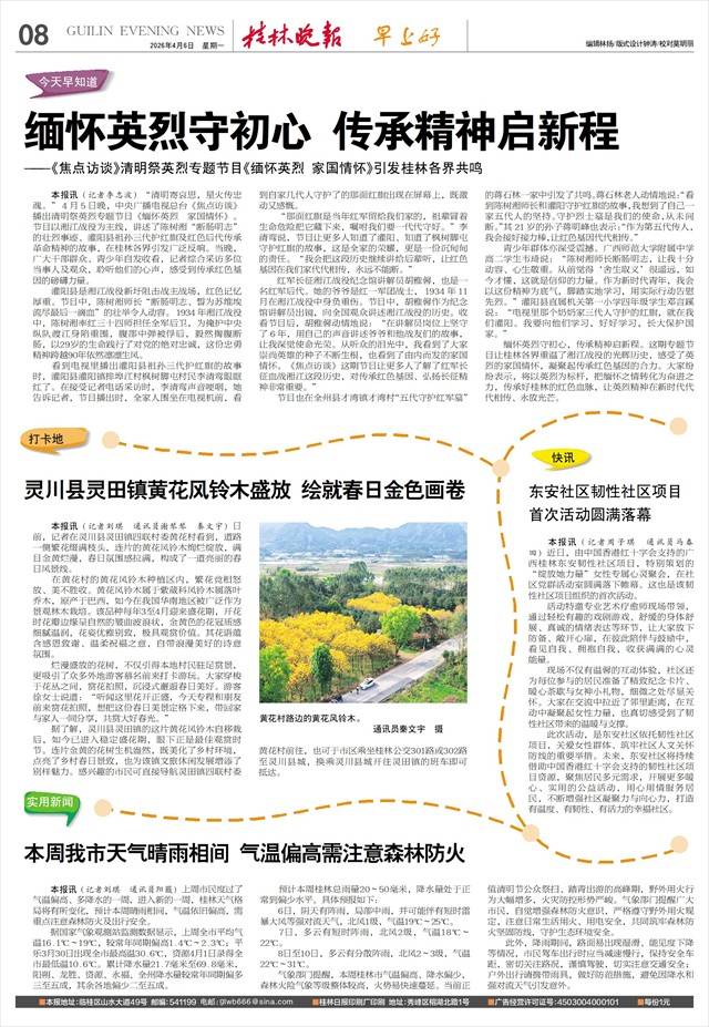缅怀英烈守初心,传承精神启新程。这期专题节目让桂林各界重温了湘江战役的光辉历史,感受了英烈的家国情怀,凝聚起传承红色基因的合力。大家纷纷表示,将以英烈为标杆,把缅怀之情转化为奋进之力,传承好桂林的红色血脉,让英烈精神在新时代代代相传、永放光芒。