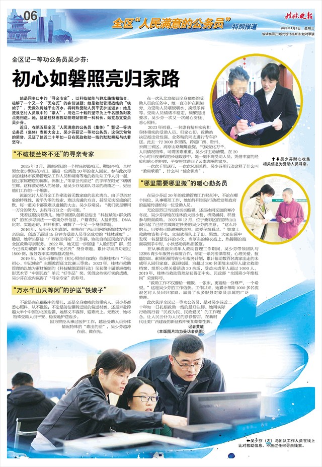 2019年,吴少芬撰写的《初心照亮归家路》荣获桂林市“不忘初心、牢记使命”主题教育征文比赛三等奖;2023年,桂林市救助管理站以她为素材编创的《科技赋能团圆行动》荣获第十届亚洲微电影艺术节“中国民政”单元“好作品”奖。凭借这些实打实的成绩,吴少芬在业内赢得了“寻亲专家”的称号。
