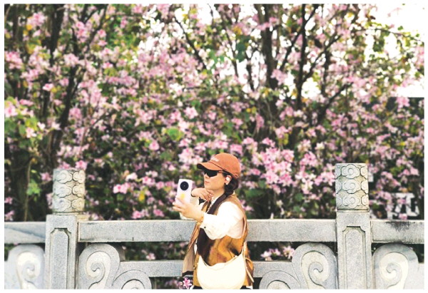 4月8日,漓江桥人行道旁,市民被怒放的花朵吸引,拿出手机与花合影,留住春光。 记者韦莎妮娜 摄