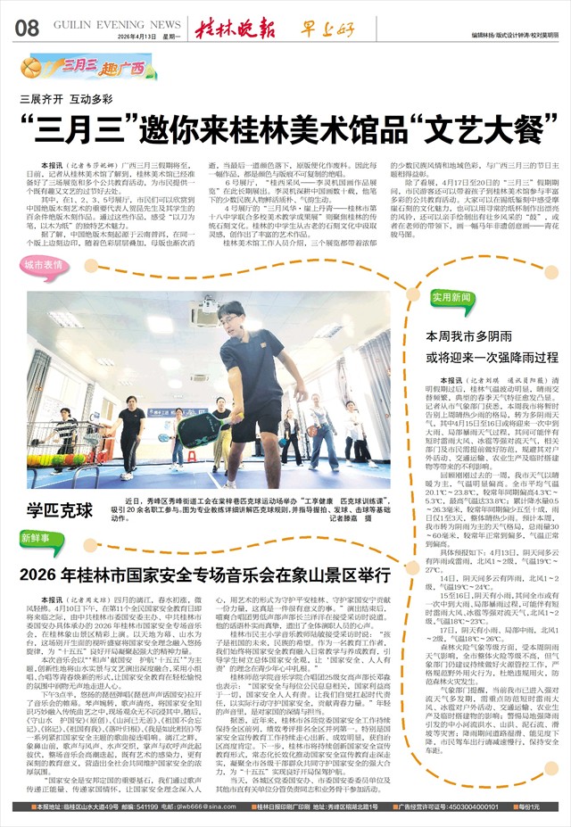 2026年桂林市国家安全专场音乐会在象山景区举行   本报讯(记者周文琼)四月的漓江,春水初涨,微风轻拂。4月10日下午,在第11个全民国家安全教育日即将来临之际,由中共桂林市委国安委主办、中共桂林市委国安办具体承办的2026年桂林市国家安全专场音乐会,在桂林象山景区精彩上演。以天地为幕、山水为台,这场别开生面的视听盛宴将国家安全理念融入悠扬旋律,为“十五五”良好开局凝聚起强大的精神力量。