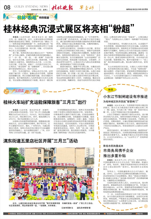 桂林经典沉浸式展区将亮相“粉超”   本报讯(记者李思静 通讯员韦佳贝)赴一碗粉之约,品一座城之美。近日,记者从桂林市世界级旅游城市建设促进局了解到,在即将举行的“潮动三月三·桂林首届米粉超级联赛”中,由该局承办的“桂林经典沉浸式展区”亦将同步亮相桂林市甲天下会展中心,为市民游客打造一场可感、可触、可互动的桂林山水人文沉浸盛宴。