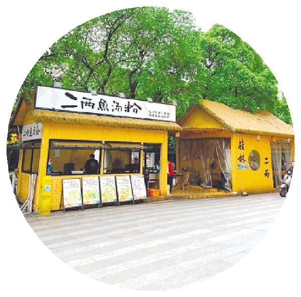 顺着食客推荐,日前记者来到位于百年荟广场上的二两鱼汤粉店。两间茅草顶小屋十分显眼:左边是出餐操作间,右边则是用餐区。门口一排实拍菜品展示牌,直观呈现每碗鱼汤粉的真材实料。