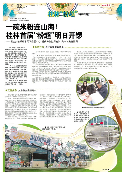 桂林首届“粉超”明日开锣 ——记者实地探班甲天下会展中心 提前为您打探赛制、亮点与宠粉福利   4月17日,桂林市甲天下会展中心将迎来一场前所未有的全国性美食盛会——潮动三月三·桂林首届米粉超级联赛(以下简称“粉超”)。这场以“粉聚桂林·香飘世界”为主题的活动,将持续4天,集专业厨艺竞技、非遗文化展示、全民互动体验于一体,力求打造中国米粉行业的标杆交流盛事。