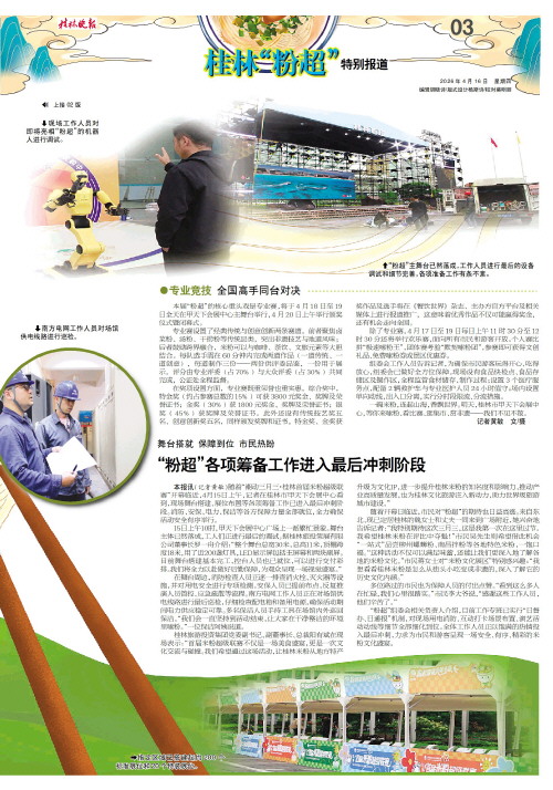 舞台搭就 保障到位 市民热盼 “粉超”各项筹备工作进入最后冲刺阶段   本报讯(记者黄敏)随着“潮动三月三·桂林首届米粉超级联赛”开幕临近,4月15日上午,记者在桂林市甲天下会展中心看到,现场舞台搭建、展位布置等各项筹备工作已进入最后冲刺阶段。消防、安保、电力、保洁等各方保障力量全部就位,全力确保活动安全有序举行。