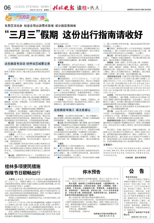 各景区活动多 短途自驾出游需求激增 部分路段易拥堵 “三月三”假期 这份出行指南请收好   2026年广西三月三假期从4月17日至20日,共计放假4天,期间高速公路不实行免费通行政策。据交管部门预判,节日期间,因本市各景区活动多、短途自驾出游需求激增等因素,辖区高速、国省道及县乡道路车流将明显上升,道路拥堵、交通安全风险随之增大。为此,记者梳理了这份出行指南,请大家合理规划、错峰出行、文明驾驶。