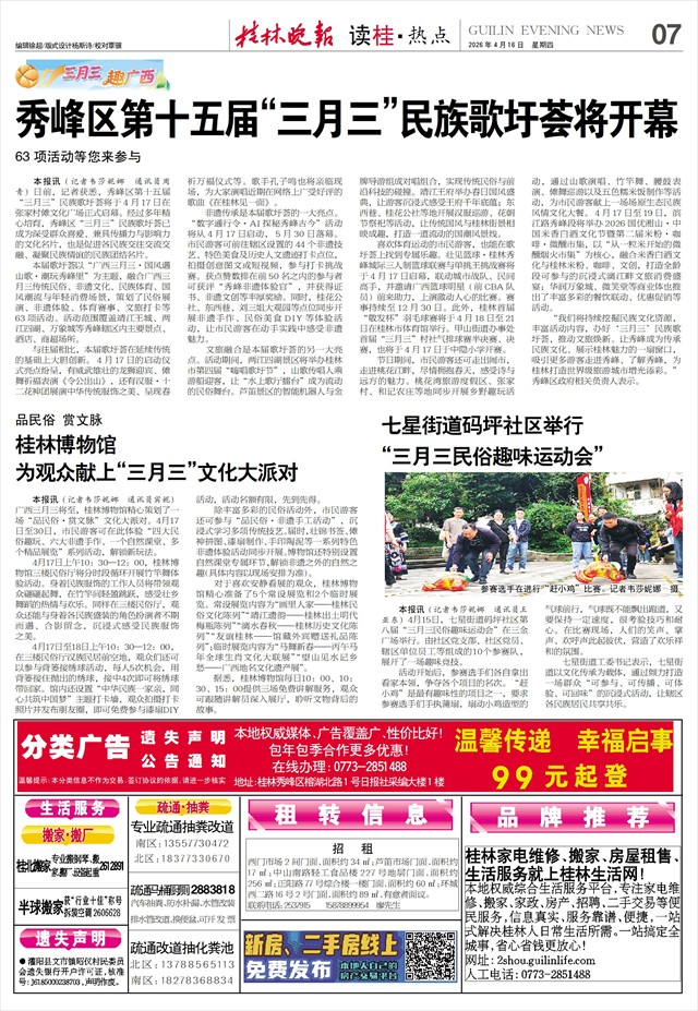 秀峰区第十五届“三月三”民族歌圩荟将开幕 63项活动等您来参与   本报讯(记者韦莎妮娜 通讯员周青)日前,记者获悉,秀峰区第十五届“三月三”民族歌圩荟将于4月17日在张家村傩文化广场正式启幕。经过多年精心培育,秀峰区“三月三”民族歌圩荟已成为深受群众喜爱、兼具传播力与影响力的文化名片,也是促进各民族交往交流交融、凝聚民族情谊的民族团结名片。
