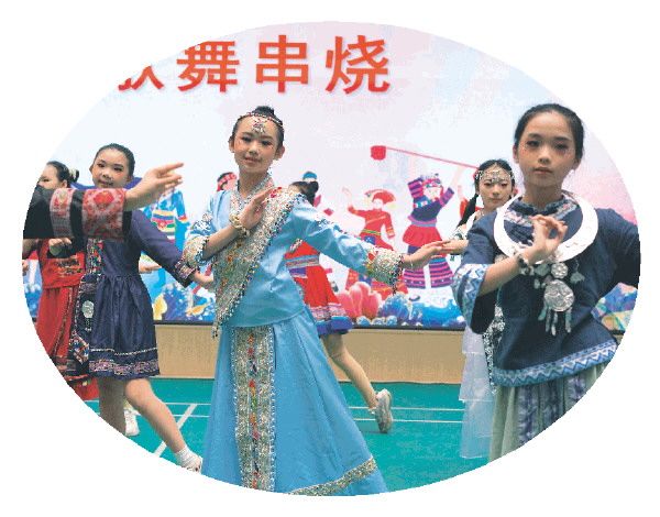此外,奎光学校还将民族文化融入到了其他课程当中。该校化学老师专门开设了如何用天然染料制作五色糯米饭的课堂环节;美术老师带领学生制作银饰头饰;音乐课上,学生们学唱民族歌曲、学跳民族舞蹈。每年年末,奎光学校举办校园文化艺术节,并明确规定:进入决赛圈的节目中,少数民族节目必须占50%以上。