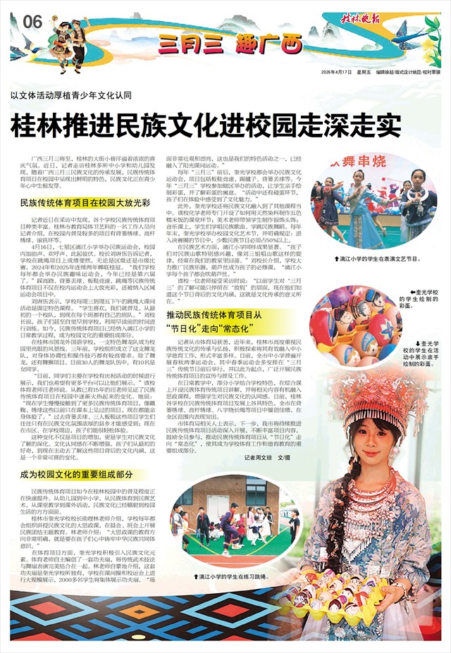 以文体活动厚植青少年文化认同 桂林推进民族文化进校园走深走实   广西三月三将至,桂林的大街小巷洋溢着浓浓的喜庆气氛。近日,记者走访桂林多所中小学和幼儿园发现,随着广西三月三民族文化的传承发展,民族传统体育项目在校园中呈现出鲜明的特色,民族文化正在青少年心中生根发芽。
