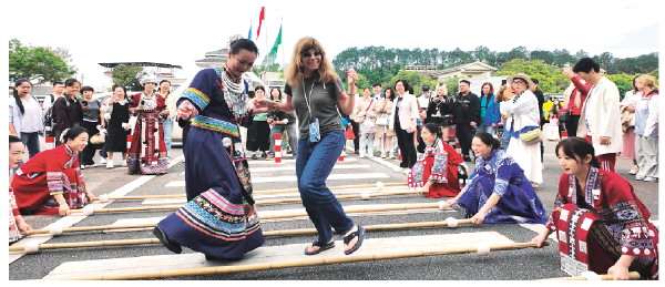 4月17日,登漓江游船前,游客在竹江码头体验传统竹竿舞。 通讯员阳莹 摄