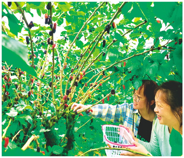 图为游客在该基地采摘桑果。 记者李凯 摄