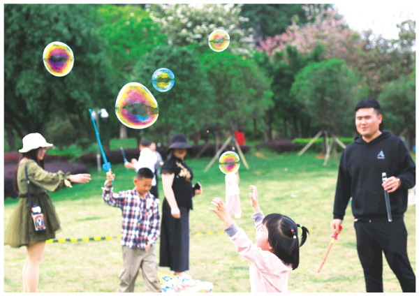 近日,在临桂山水公园,家长带着孩子一起吹泡泡,享受快乐的亲子时光。