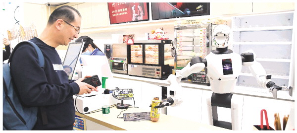 4月22日,在北京市海淀区中关村大街一座大厦内的便利店,机器人将抓取好的饮料交给顾客。