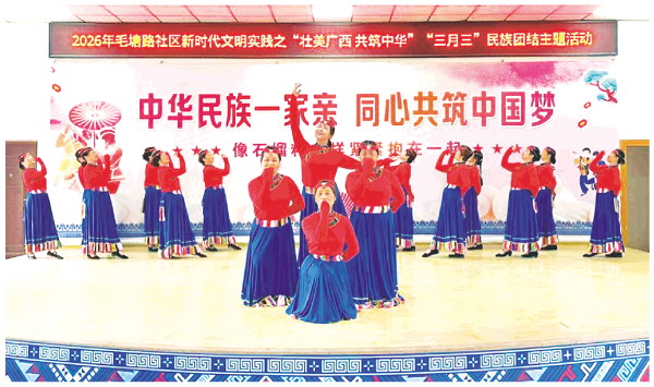 “心想唱歌就唱歌,山歌唱得花满坡……”近日,七星区漓东街道毛塘路社区活动室里歌声悠扬、舞步翩跹,社区艺术团的队员们正为即将到来的主题文化活动紧张排练。大家围坐在一起讨论走位、分配歌词、调整队形,欢声笑语充满整个空间,氛围热烈又融洽。这支扎根社区整整24年的文艺队伍,早已成为辖区家喻户晓的“文化名片”,他们以艺术为纽带,把歌舞与温情送到居民家门口,既丰富了群众精神文化生活,又凝聚起浓浓邻里情,成为基层治理中一股温暖而坚实的力量。