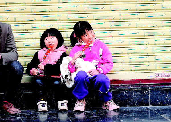 元旦假期,正阳路步行街上一位家长带着两个小朋友在街边休息,两个孩子专心地吃着冰糖葫芦,这或许就是她们逛街最大的幸福。