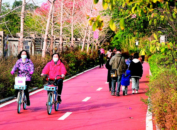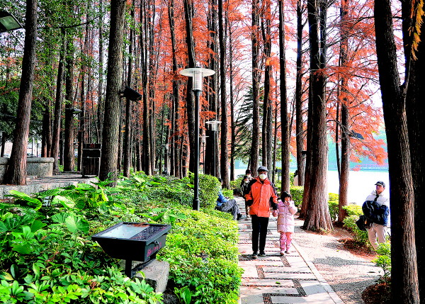 在漓江边的河堤上,小女孩拉着爸妈的手幸福地荡来荡去,感受亲情温暖;年轻的男女举着风筝,在风中开心奔跑,享受浪漫时光。在两江四湖边火红的水杉林间,摄影爱好者举起相机定格下树叶间迷人的光线,凉亭内的红衣少女则正在遨游书海。在桃花江畔的鲁家村,农家乐前挤满了郊游的人们,美味的豆腐花让大家忘却了游玩的疲劳。芦笛三村的绿道上,健身锻炼的人群不断,跑步达人组队前行,亲子编队也不甘落后,阳光下洒满欢笑。