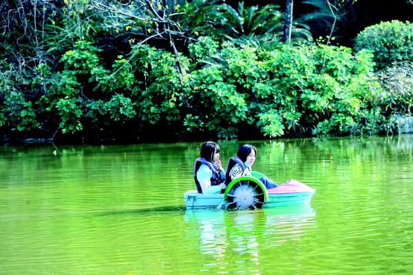 在园林植物园,市民趁着天气晴好乘船游玩。