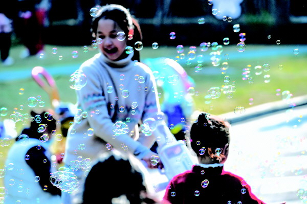 3日下午在桂林园林植物园,几名孩子被从泡泡机里吹出来的泡泡吸引住,一起嬉戏。虽然孩子们可能互不相识,但在这个“泡泡世界”里,孩子们同样玩得开心不已。记者滕嘉 摄