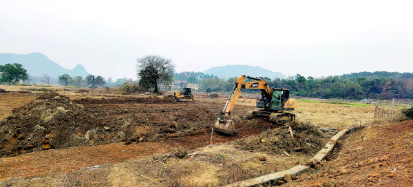 挖掘机在整理南一村的土地,这里未来将是一片数百亩的稻田。