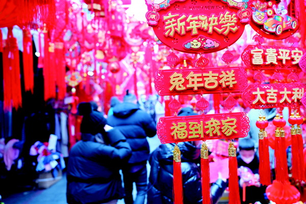 1月5日,市民在安徽合肥城隍庙市场选购新春饰品。