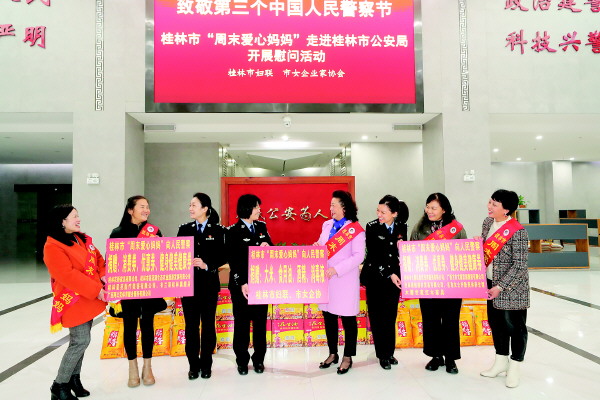 1月10日是第三个“中国人民警察节”。11日,桂林市妇联、市女企业家协会以及“周末爱心妈妈”一起来到桂林市公安局,慰问我市公安干警,向人民警察致敬,并送去大米、消毒酒精、健康券等价值4万元的生活、防疫物资。记者李凯 摄