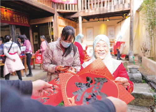 13日,在春节来临之际,雁山区组织书法爱好者来到草坪回族乡潜经村,为这里的回族同胞写春联,送福字。图为一位书法爱好者给村民们送福字。记者滕嘉 摄