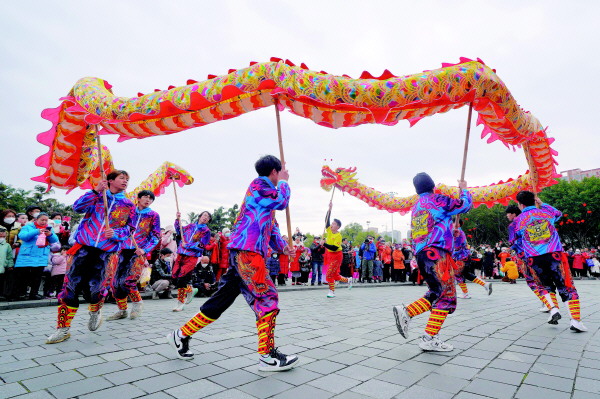 18日,在灵川县,人们在春节喜乐嘉年华活动上表演舞龙。
