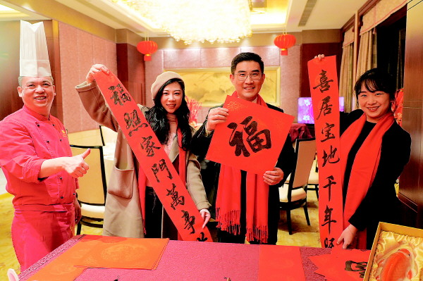 桂林各大酒店装扮一新,准备迎接各地游客。图为春节前,桂林香格里拉大酒店工作人员写春联写“福”字,喜迎新春佳节。记者李凯 摄