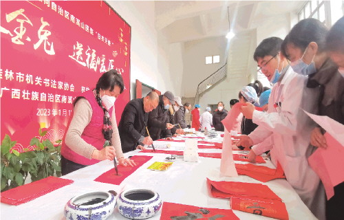 近日,广西壮族自治区南溪山医院工会邀请了13名来自桂林市机关书法家协会的书画家走进医院,开展主题为“翰墨迎金兔·送福暖医心”活动。书画家们用饱含深情的作品,向日夜奋战在抗疫和救死扶伤一线,守护人民群众健康的“白衣天使”献上一份特殊的新春大礼,并祝愿南溪山医院为桂林的健康事业做出新的贡献。通讯员张超群 摄