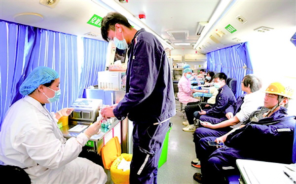 第一批献血志愿者几乎都是柳钢的青工。还在上着班的00后李华赶来献血,他头上的安全帽和身上的工作装备都还没有卸下。他是看到同事在朋友圈里转发了阳阳的报道后,请假前来献血的。