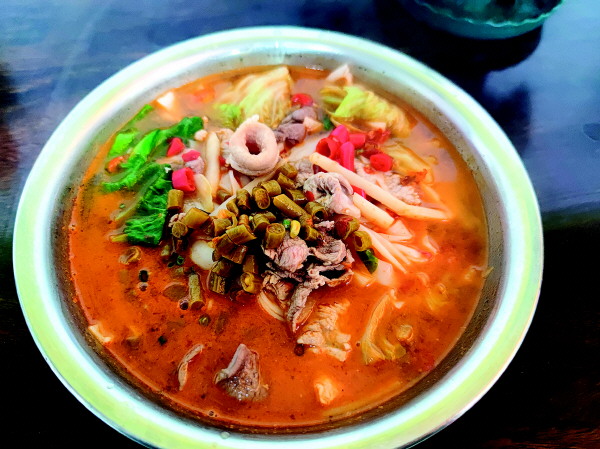 色泽鲜艳、汤底鲜美的酸辣粉。