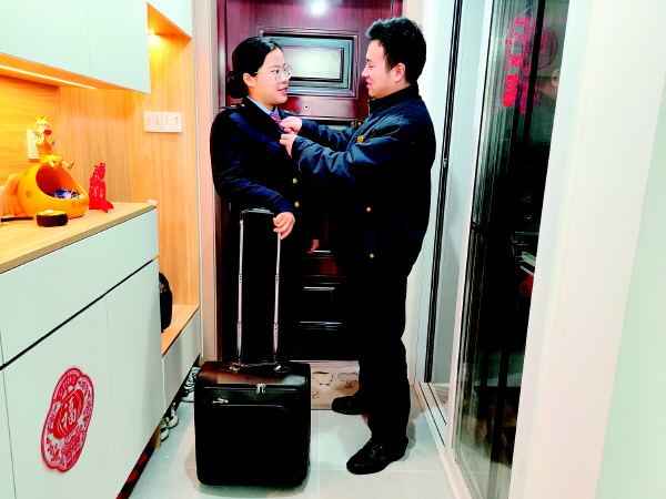 相聚的欢乐时光短暂,两人共同在家里没待两天,董晓琳出发去上班了。临行前,周国智在家门口给董晓琳整理了制服,二人依依惜别,回到工作岗位上继续守护春运路。