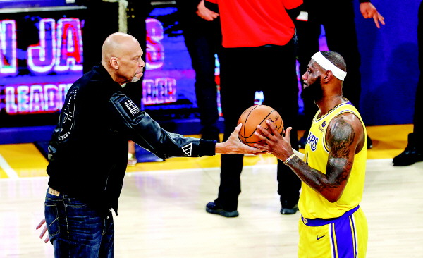 NBA传奇球星贾巴尔(左)祝贺詹姆斯打破纪录。新华社发