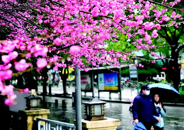 8日,环城北二路香格里拉大酒店前一排红梅盛情绽放,娇艳欲滴的朵朵红梅在雨中更妩媚,给人们送来春的讯息。 记者李凯 摄